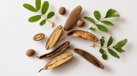 This image showcases rustic dried pods accompanied by natural spices and green leaves, beautifully arranged on a neutral surface, perfect for culinary or botanical themes.