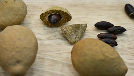 Baru Nuts displayed in different forms on top of a wooden desk inside their shell or peeled off