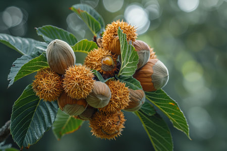 Bunch of chestnut on tree.Chestnut tree plant with chestnut seeds background