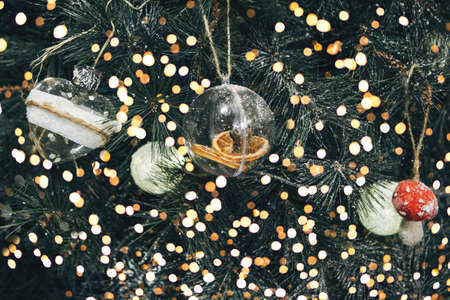 Beautiful Christmas decorations hanging on a Christmas tree. Home decoration for Christmas.