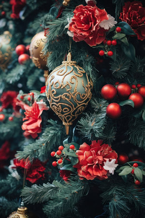 Close up on beautifully decorated christmas tree AI generated illustration