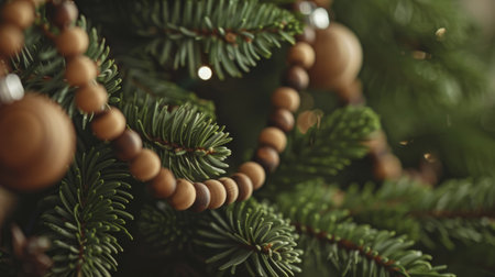 Wooden bead garland on pine tree branches during Christmas season. Christmas handmade decor and craftwork, eco friendly, sustainable concept.
