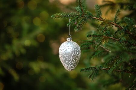 White ornament Christmas decoration toy hanging on a spruce branch with bokeh
