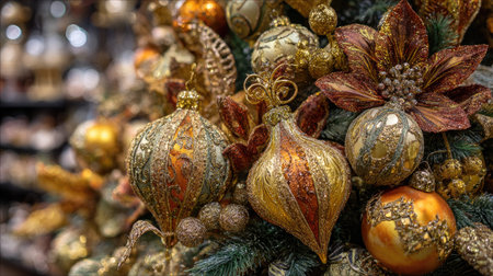 Discover a stunning display of luxurious gold ornaments and festive decorations, perfect for enhancing any holiday atmosphere during the Christmas season.