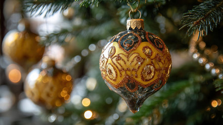 A beautiful blue ornament with intricate gold designs is hanging from a green pine tree branch. This scene captures the festive spirit of the holiday season showcasing seasonal decorations.