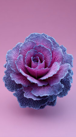 Close-up of a beautiful purple ornamental cabbage flower, set against a soft pink backdrop, showcasing its intricate details.