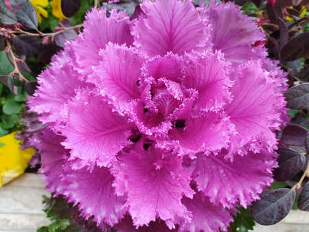 Ornamental cabbage pink purple plant in the garden, blooming, close-up, background. Purple Cabbage curly flower.