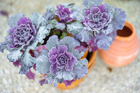 Frozen leaves of decorative cabbage growing in pots outdoors