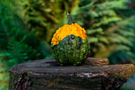 Small-fruited decorative Pumpkin. Ugly vegetables. Halloween design. Minimalistic composition. Autumn still life.