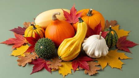 Autumn still life with pumpkins and colorful leaves on green background