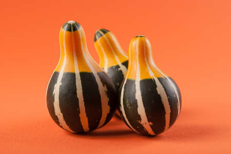 Little Decorative pumpkins on orange background, selective focus. Autumn concept