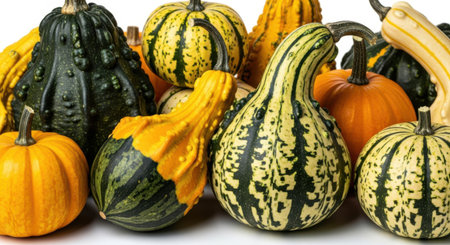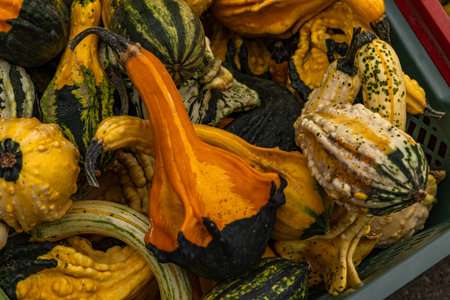 Fresh colorful gourds in various shapes and colors arranged in bulk, symbolizing autumn harvest, organic farming, seasonal vegetables and natural decoration for food and lifestyle visuals.