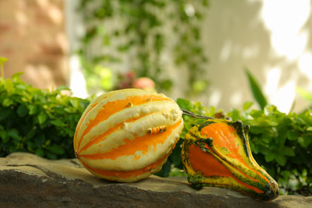 Whole ripe pumpkins on stone curb outdoors