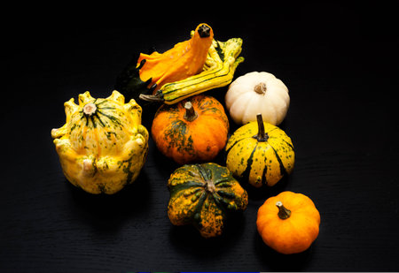 various autumn pumpkins on a black background. autumn still life