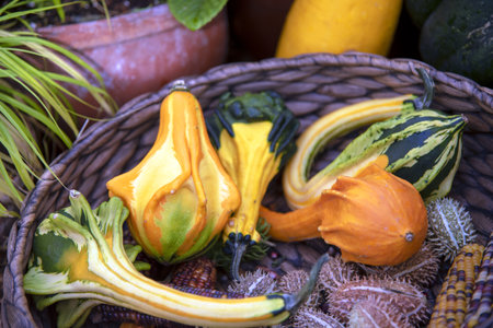 Bright unusual pumpkins and other vegetables in a wicker basket.