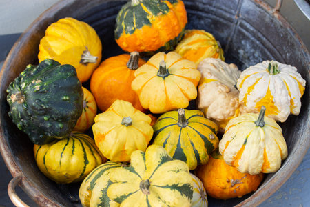 A bunch of small ripe pumpkins in a metal bowl top view. Striped decorative green orange white pumpkin. Harvesting vegetables, Thanksgiving