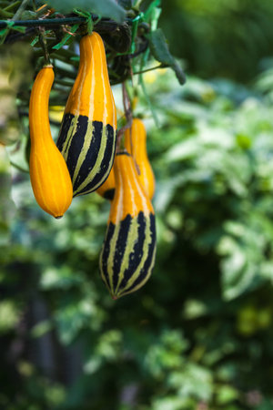 Growing Gourds. Speckled Swan or Korba hanging on vines