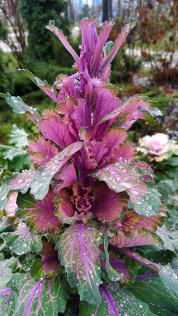 Purple ornamental decorative flowering cabbage covered with a morning dew, selective focus