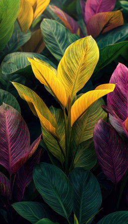 An artistic close-up showcases colorful tropical plant leaves in various hues. The leaves exhibit textured surfaces with shades of green, yellow, and magenta. The composition highlights a natural environment. Suitable for a wide range of commercial and editorial purposes.