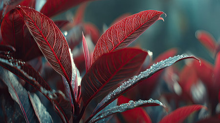 This image showcases striking red leaves, possibly part of a plant. Water droplets cling to the leaves, enhancing their texture and detail. The composition focuses on the plant, set against a blurred background. This photograph could be utilized for various commercial purposes, including decorative designs and nature-related content.