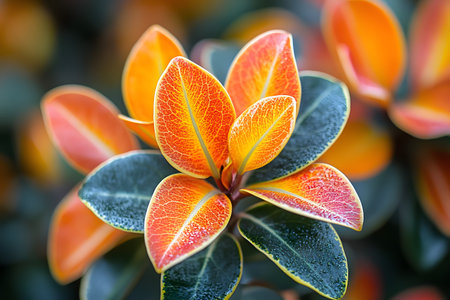 Close-up view of vibrant leaves displaying a striking combination of orange and green hues, the beauty of autumn foliage. the intricate patterns and dew droplets add a refreshing touch, perfect for seasonal decor or nature-themed designs. Generative AI