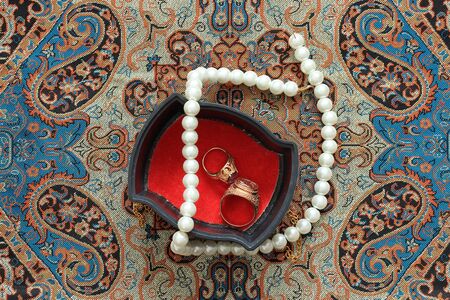 CESENA, ITALY - NOVEMBER 18, 2018: lights are enlightening ancient Eastern rugs for sale in Antiques Fair
