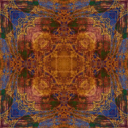 Vintage patchwork background on retro handmade carpet. Patterns on texture of old blanket surface.