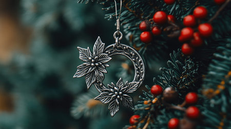 A stunning close-up of a silver Christmas ornament featuring intricate leaves and berries, beautifully suspended among lush green pine branches.