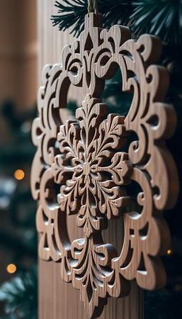 Exquisite Carved Wooden Christmas Ornament Close-up.