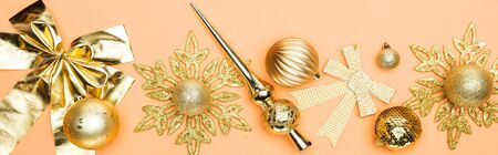 top view of festive golden christmas decoration on orange background, panoramic shot