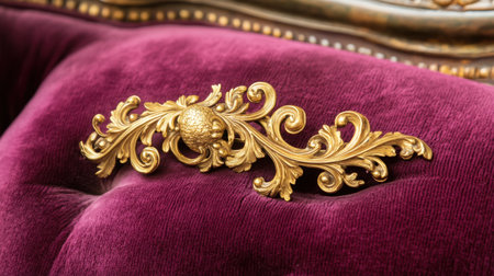 A stunning golden decorative element rests on rich purple velvet upholstery, showcasing fine craftsmanship and luxurious design, perfect for adding elegance to any interior.