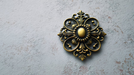 A detailed closeup of an antique decorative metal piece, featuring intricate designs on a textured surface, ideal for home decor or artistic inspiration.