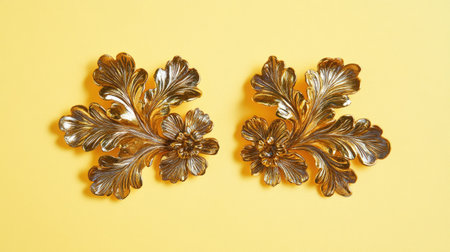 Ornate gold earrings with delicate engravings placed on a pastel yellow gradient background.