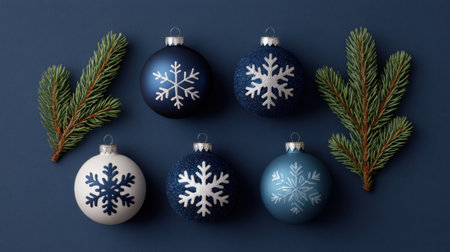 This image features elegant Christmas ornaments adorned with snowflakes, paired with fresh green pine branches, all set against a dark blue background, perfect for holiday themes.
