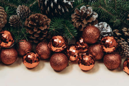 Christmas background with fir branches, balls and garlands. Tonal stylization in vintage style.
