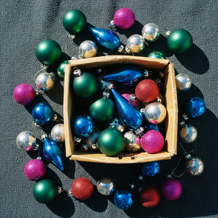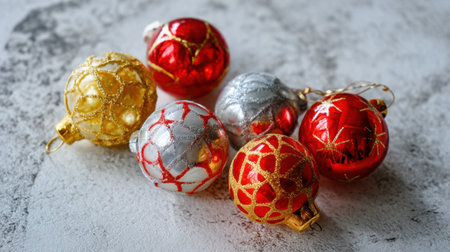 Capture the spirit of the holidays with this arrangement of colorful vintage ornaments on a light marble surface, perfect for festive decorations or seasonal celebrations.