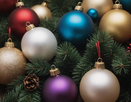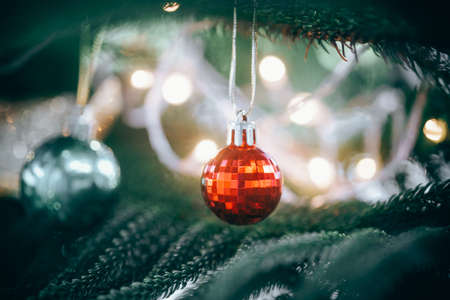 Christmas is Coming: Conceptual close-up image of the decorative balls on the branches of the Christmas tree.