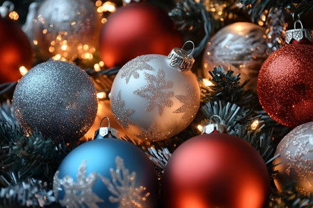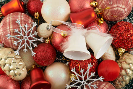 Discover a vibrant arrangement of holiday decorations including colorful ornaments, shiny bells, and sparkling snowflakes, perfect for celebrating the festive season.