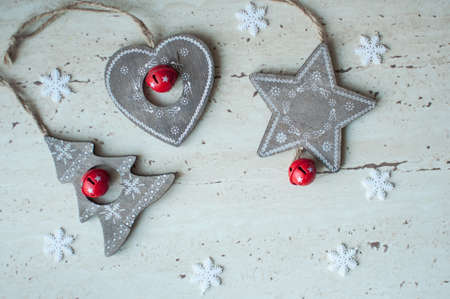 Wooden Christmas toys on the table. Tree, heart, star and white snowflakes. Flat lay, top view. Rustic Christmas background.