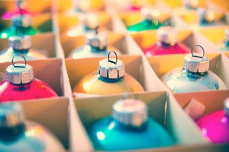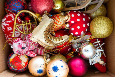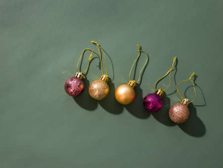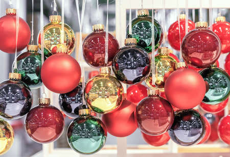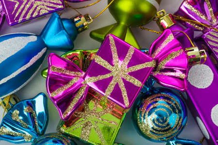 Christmas and new year tree toys. Preparing for the holidays. Multicolored shiny Christmas tree toys