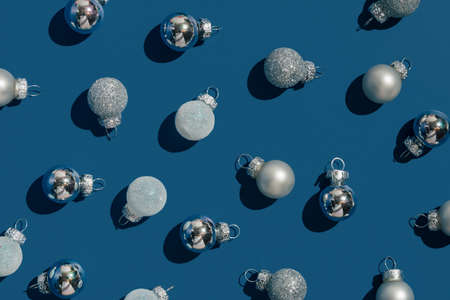 Silver glitter and shiny baubles on a pastel blue background with shadows. New Year creative pattern.