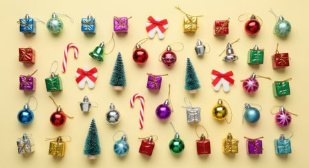 Top view of a festive pattern made from various small Christmas decorations including baubles, gifts, bells, and trees on a pale yellow surface. Holiday season concept.
