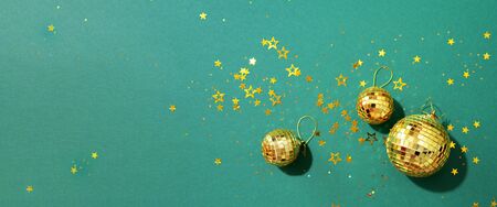 Creative Christmas concept. Shiny gold disco balls over green background. Flat lay, top view. New year baubles, star sparkles. Party time. Greeting card.
