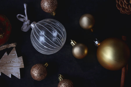 Golden Christmas decor on a black background, Christmas card. New Year's composition.
