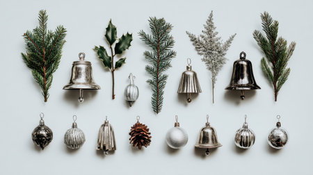A beautifully arranged collection of silver bells, pinecones, and winter greenery creates a stunning festive display, perfect for holiday decor and celebrations.