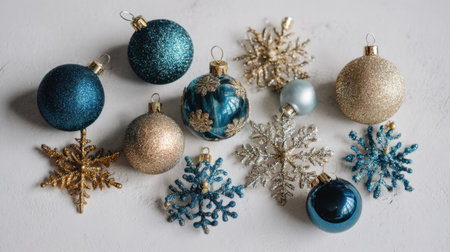 A beautiful arrangement of blue, gold, and silver Christmas ornaments alongside sparkling snowflakes, ideal for creating a festive and elegant winter atmosphere.