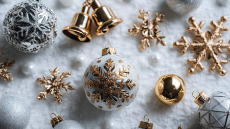 A stunning display of gold and white Christmas ornaments, featuring bells, snowflakes, and decorative elements that capture the essence of the festive season beautifully.