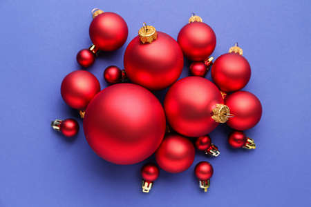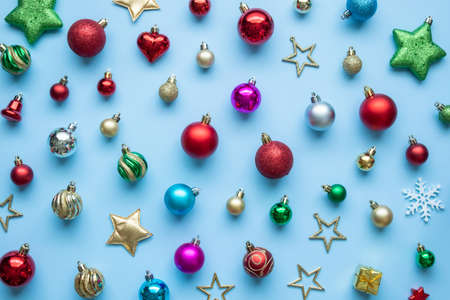 Bright, colored, shiny Christmas decorations on a colored background, full screen.