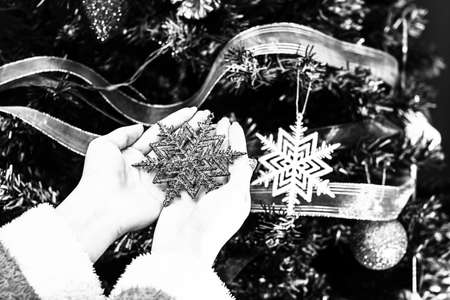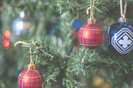 Greeting Season concept.hand setting of ornaments on a Christmas tree with decorative light