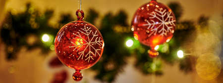 Banner with Christmas decoration out of red baubles and unfocussed light in the background.